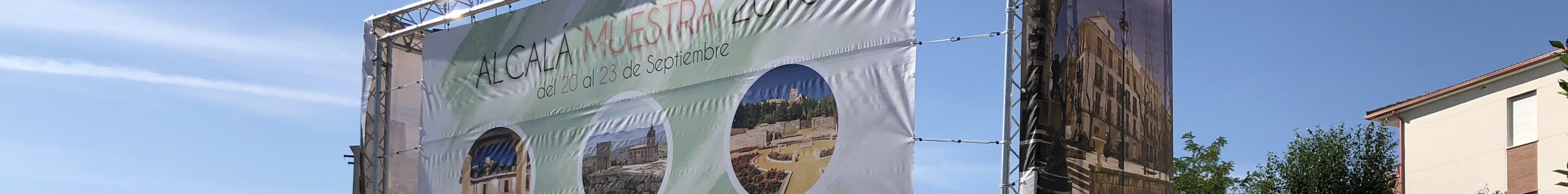 Montaje de la Feria de Muestras de Alcalá la Real del 20 al 23 de septiembre con stands, monolitos y un pórtico de entrada.